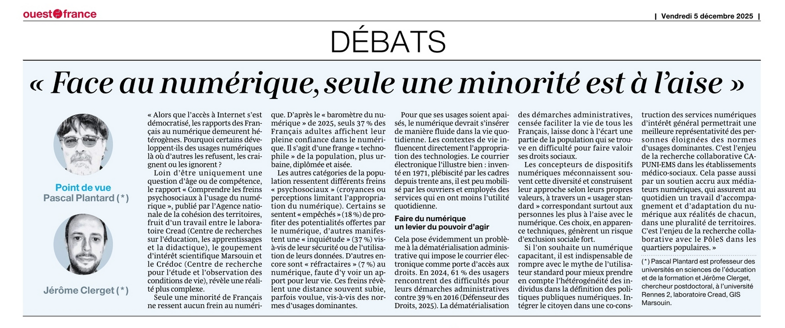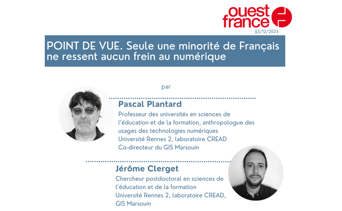 Dans une tribune publiée dans Ouest-France le 5/12/2025, Pascal Plantard et Jérôme Clerget (CREAD, Université Rennes 2, Marsouin) rappellent que les profils d’usagers du numérique sont très variés. Cette diversité, souvent négligée, complique l’adoption des outils numériques et nécessite des approches d’accompagnement mieux adaptées.