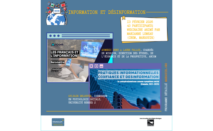 Le vendredi 13 février dernier, Marsouin a ouvert son cycle de webinaires consacré à l’information et aux médias. À l’occasion de cette première session intitulée "Information et désinformation", la quarantaine de participant·es a pu entendre deux présentations de résultats d’enquêtes. Marsouin met à disposition les supports de présentation des trois intervenant·es.